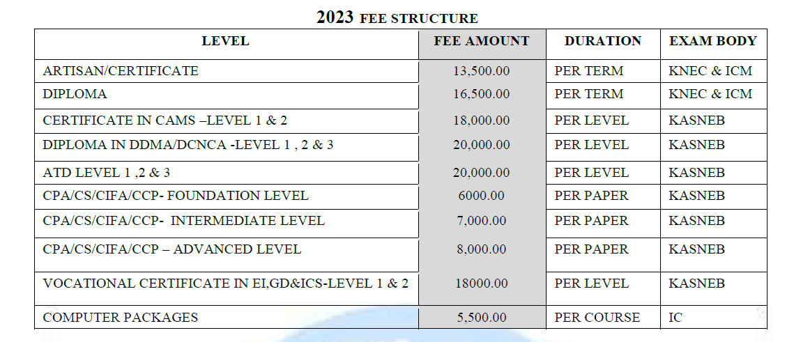 • Catering/Food and Beverage (Ksh. 4,000 per term for practical’s and Ksh. 3,000 once
